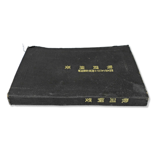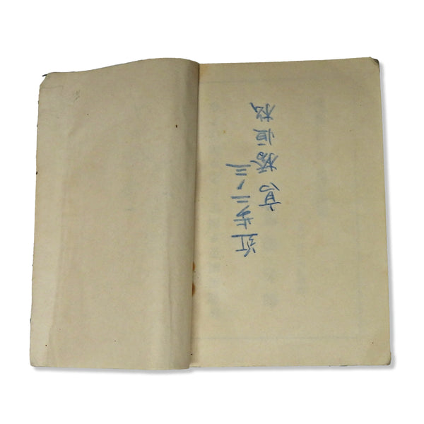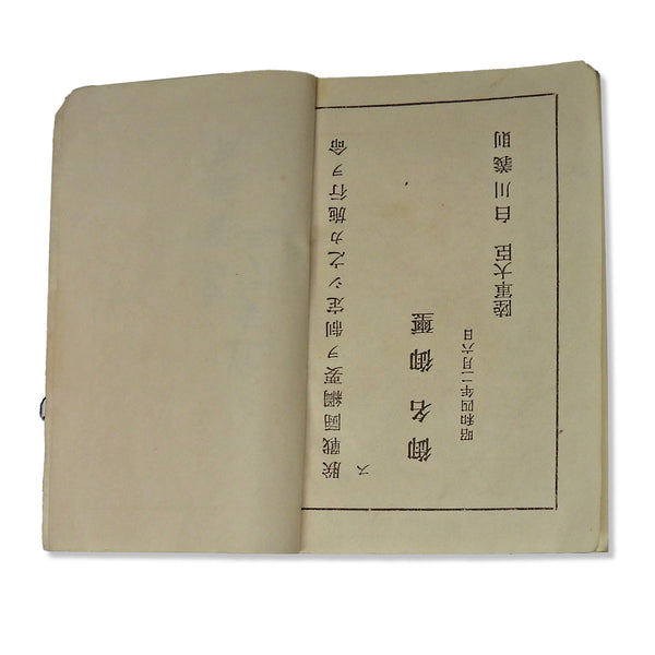 Good overall condition for its age. The first page contains handwritten entries that appear to be a soldier’s name and rank (Konan Ayumi, Mitakahashi Tsunematsu). The back cover shows bent corners, and there is general wear consistent with long-term handling.