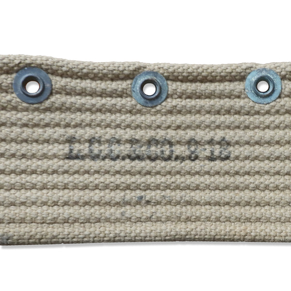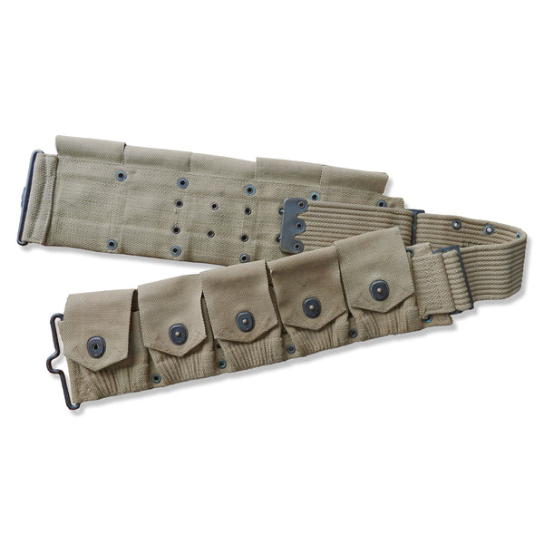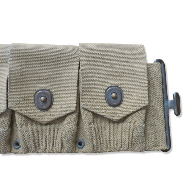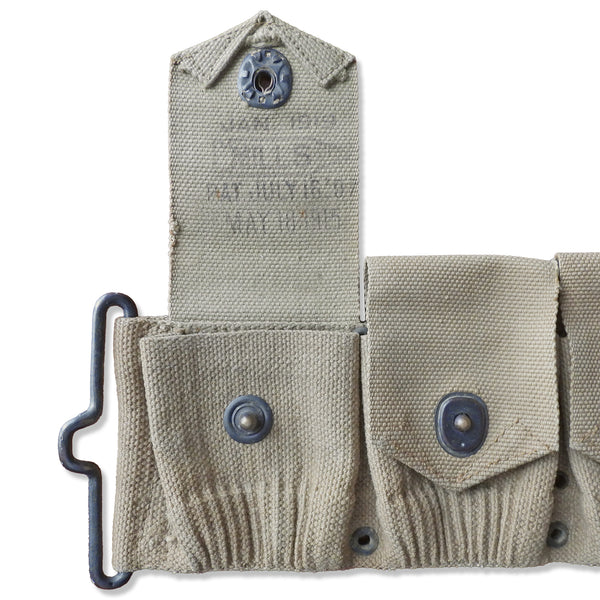 Authentic U.S. military cartridge belt from World War I. The pockets are dated 1919 and produced by Mills. The belt is dated 1918 and produced by L.C.C.& Co. Designed as personal field gear for soldiers, the belt features ten pockets and remains in fair condition considering its age.